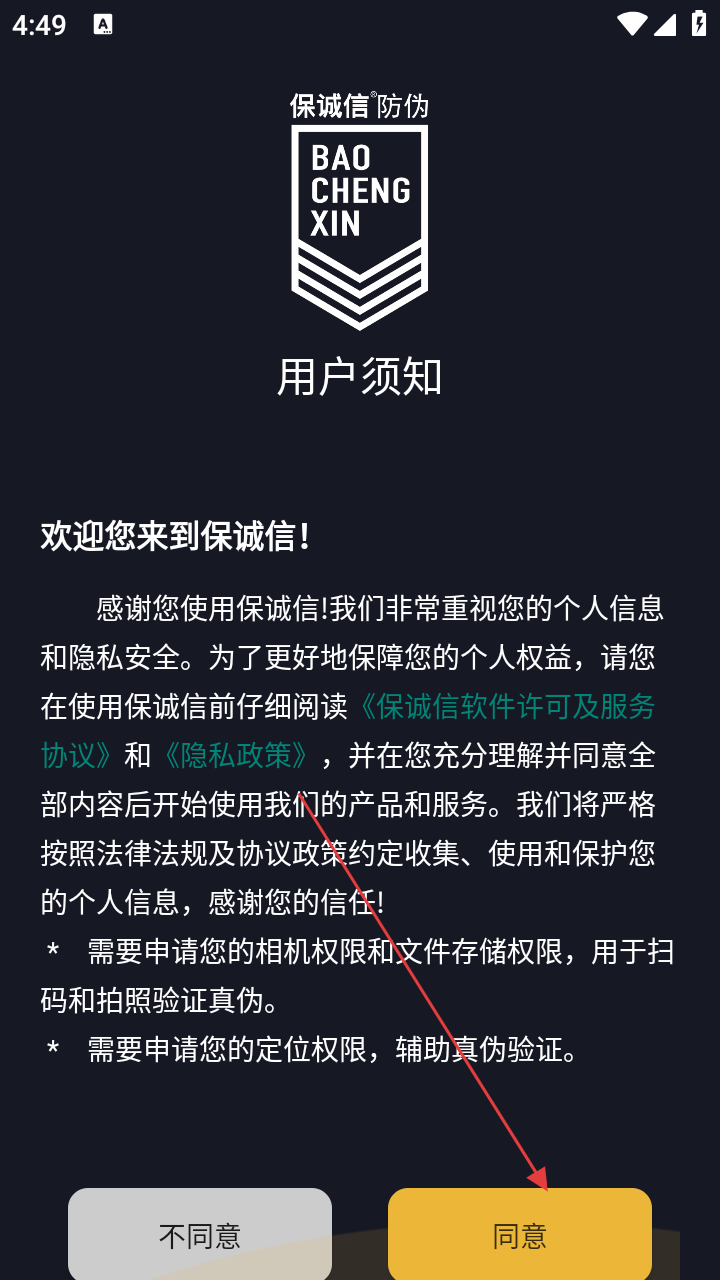 1、使用【保诚信】前,仔细阅读须知,确认同意后点【同意】,授权权限以便功能使用。
