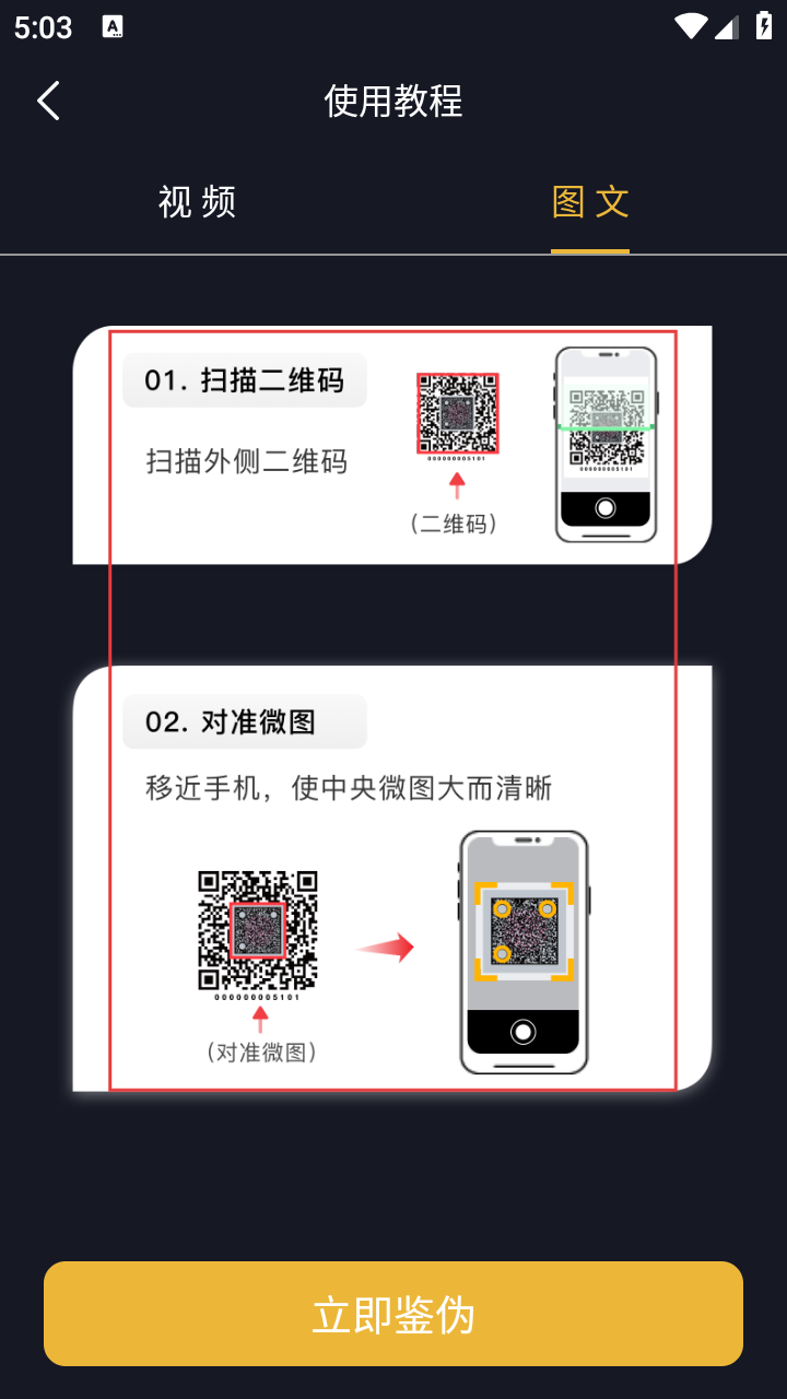 3、查看使用教程,按【扫描二维码】【对准微图】步骤操作,完成后点【立即鉴伪】。