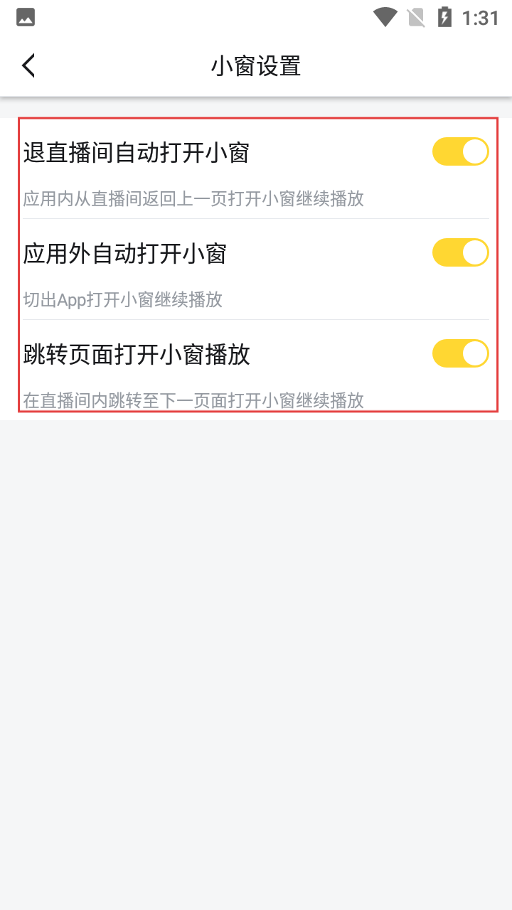 4、进入小窗设置后,可查看【退直播间自动打开小窗】【应用外自动打开小窗】等选项的开启状态。