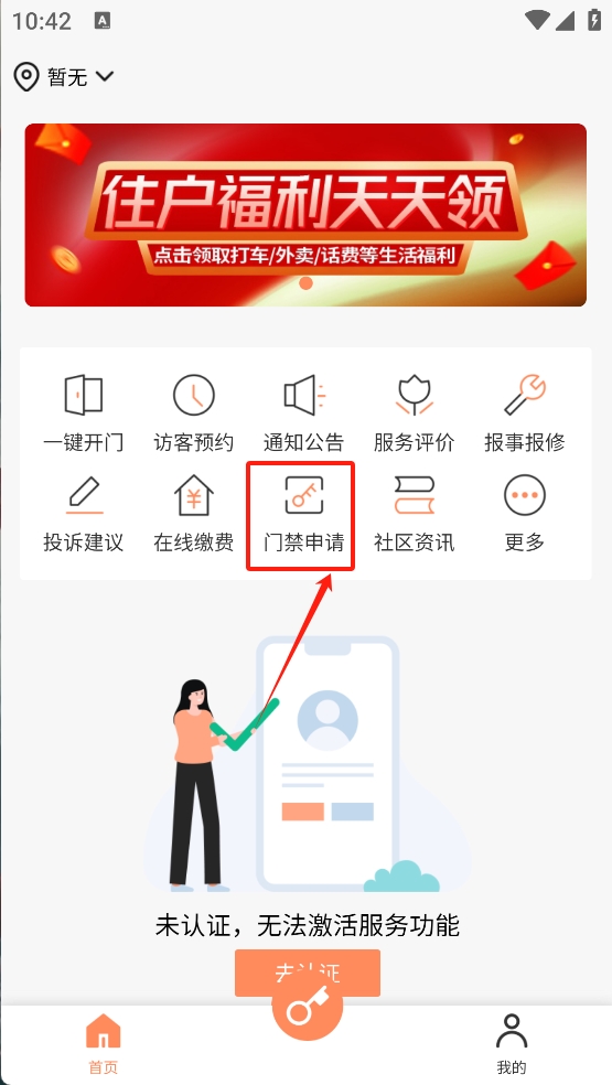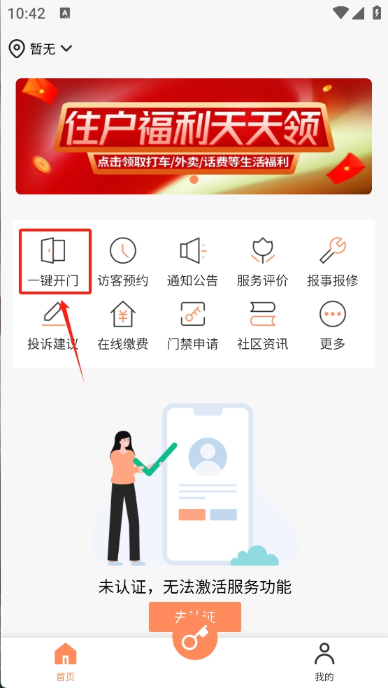 1、首先,点击“一键开门”功能,实现快速进入社区。