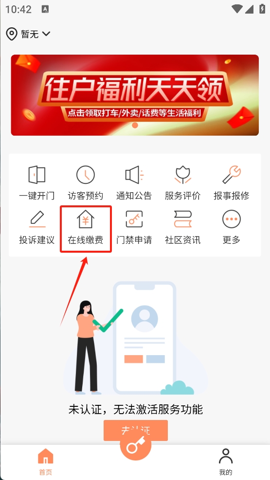 2、其次,选择“在线缴费”选项,完成社区相关费用的支付。