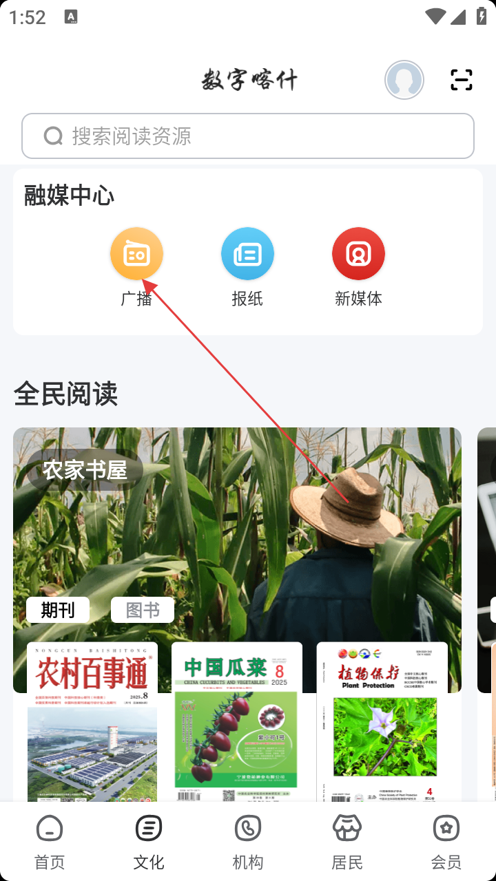 2、在文化页面的融媒中心区域,点击【广播】,进入广播频道列表页面。