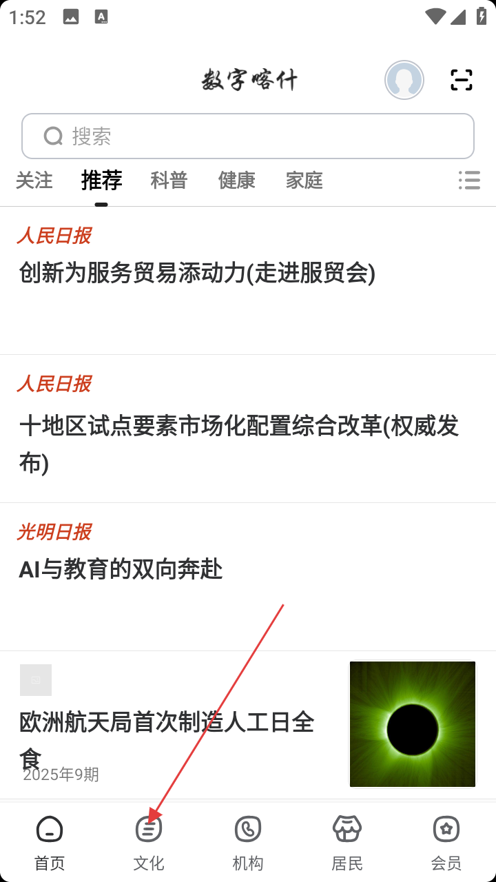 1、打开“数字喀什”APP,在首页点击底部【文化】选项,进入文化页面。
