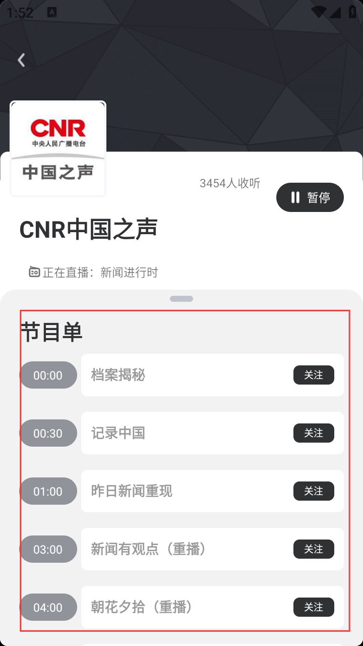 4、点击【CNR中国之声】,进入其播放页面,可查看节目单(如【档案揭秘】【记录中国】等)并收听直播。