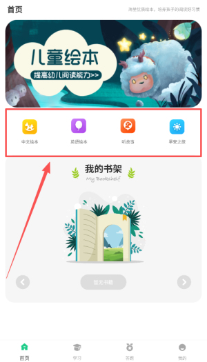 2、通过分类功能,可以很方便地找到中文绘本,英语绘本以及听故事等各类资源,激发孩子的学习热情。