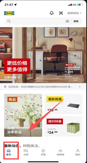 1、打开首页先选地址再点更低价格,限时特惠奥GER椅立省5元。