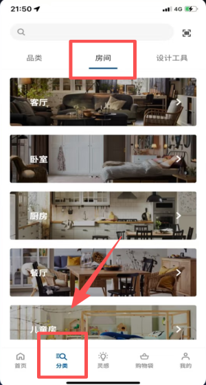 3、点分类选房间再选设计工具,客厅卧室厨房单品一键配齐。