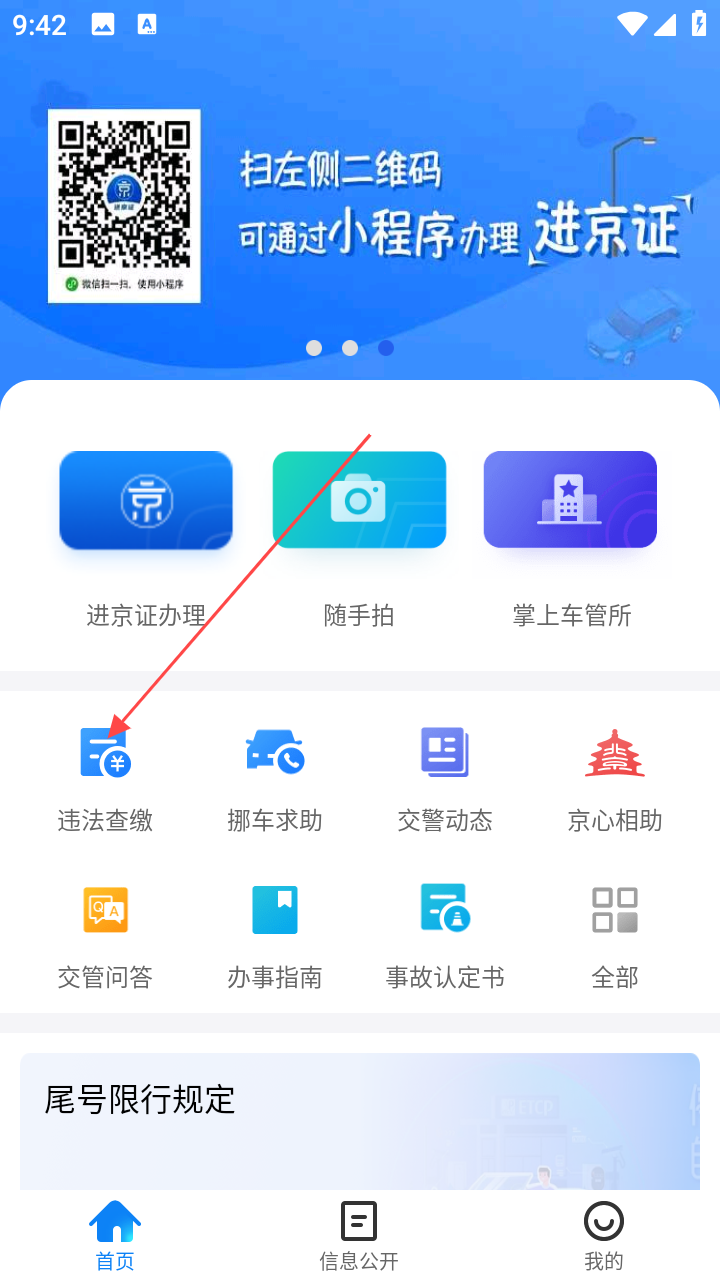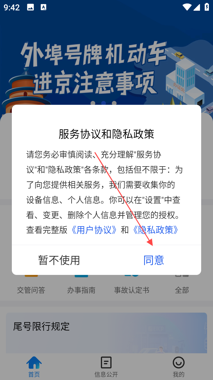 1、打开北京交警,在服务协议弹窗点击【同意】,进入首页。