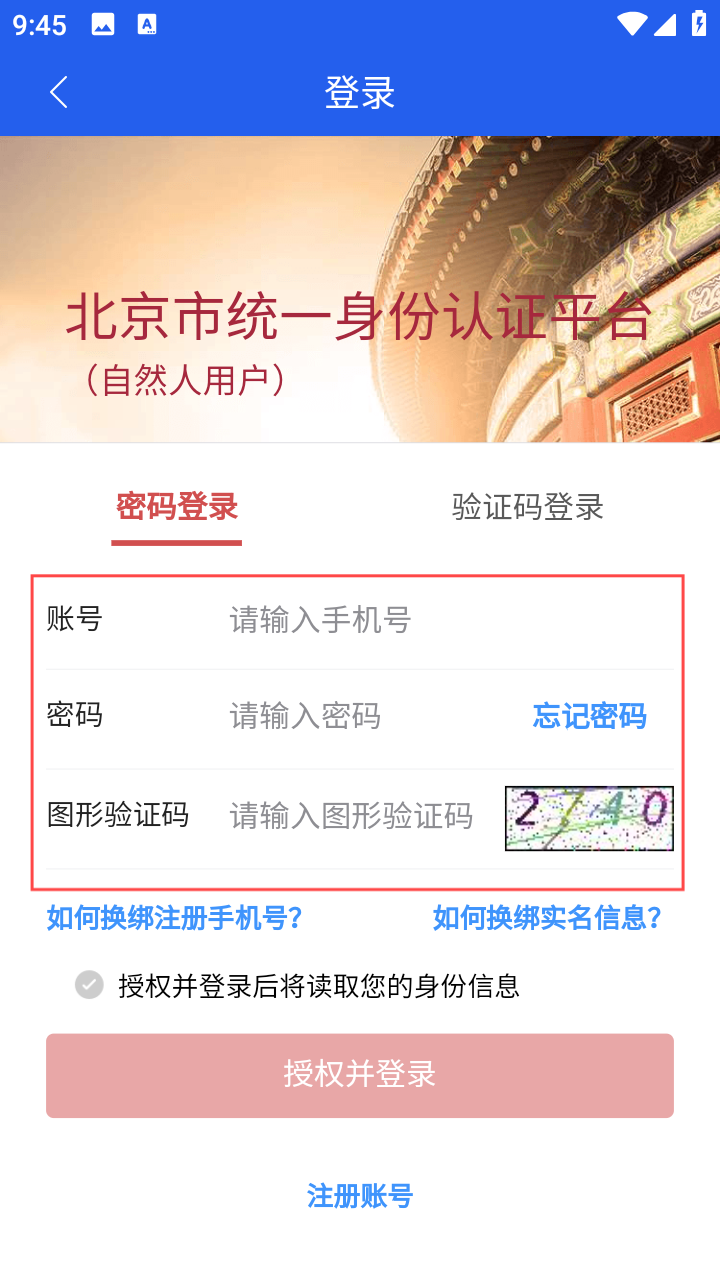 3、在登录页输入手机号、密码、图形验证码,点击【授权并登录】完成操作。