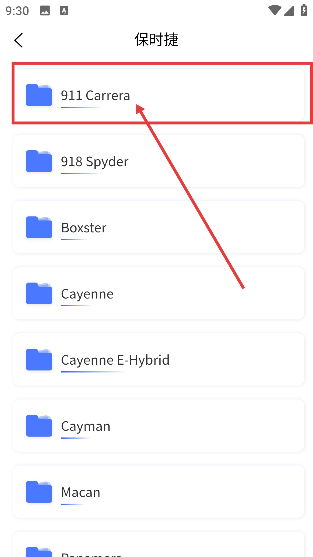 2、在【车型库保时捷】页,选【911Carrera】车型,进入年款选择页。