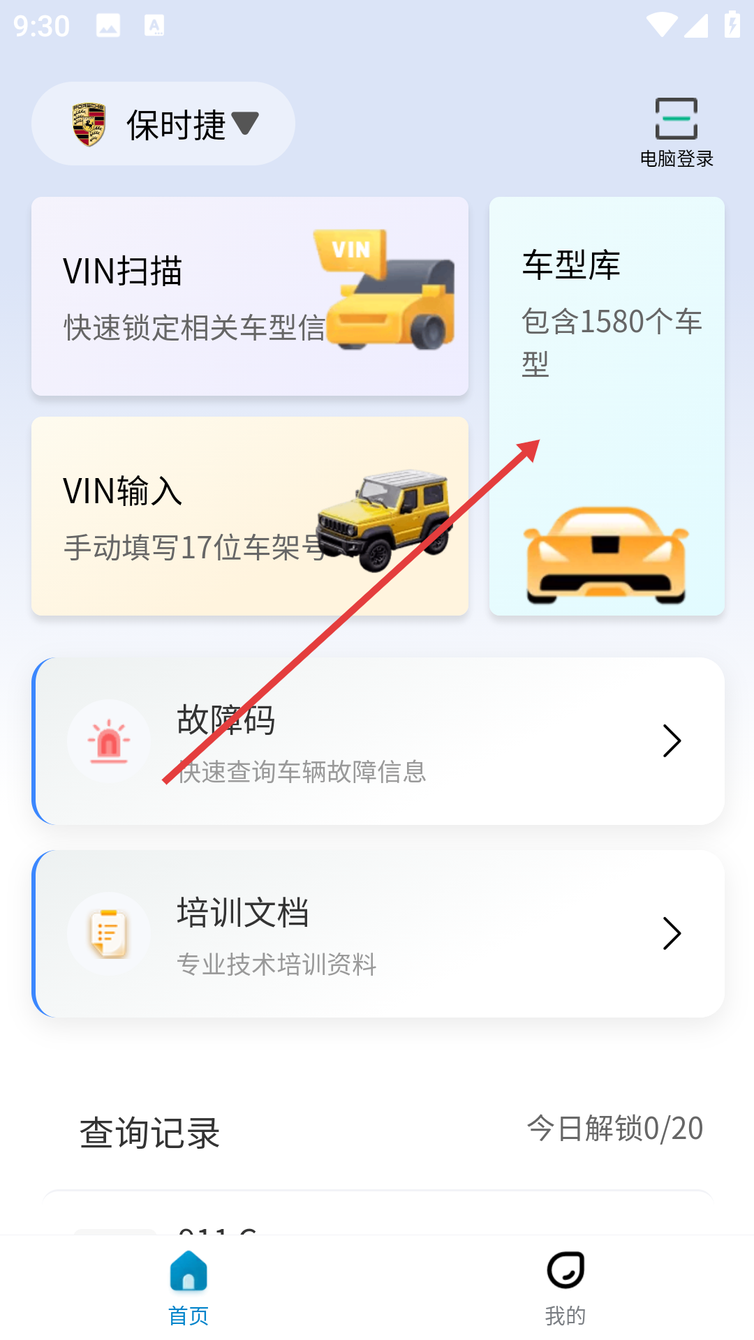 1、打开应用,在首页点击【车型库】,进入车型选择页。