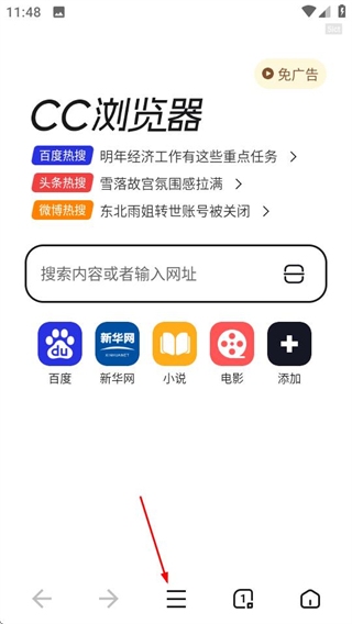 1、在CC浏览器首页,点击底部的菜单按钮,展开功能菜单。