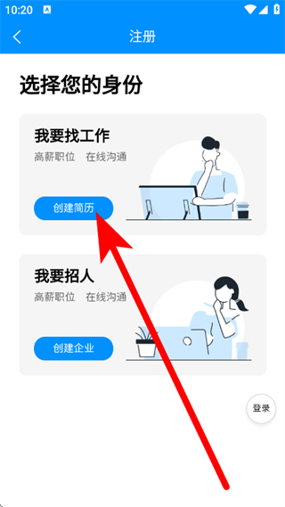 4、进入身份选择页面后,选定“我要找工作”这一选项,接着点击“创建简历”按钮。
