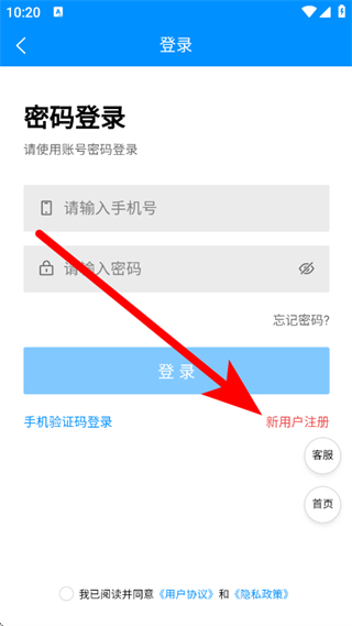 5、进入新用户注册界面后,依次输入手机号与验证码,勾选相关协议,点击注册按钮,即可完成注册流程。