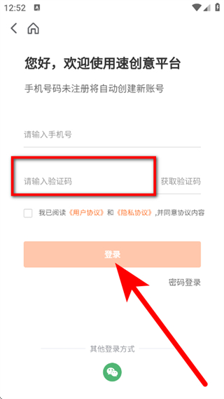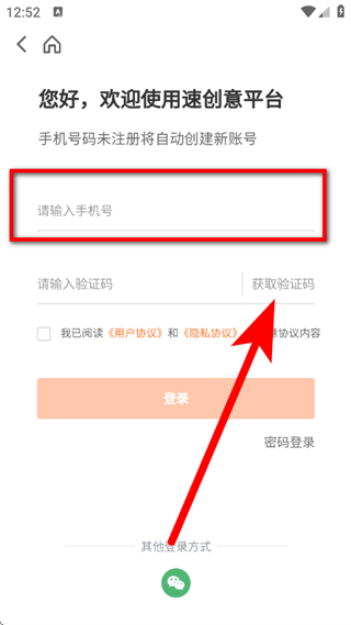 3、在速创意平台登录页面,输入手机号,点击获取验证码。