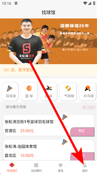 1、打开找球馆应用,点击底部导航栏的“我的”选项,进入个人中心页面。