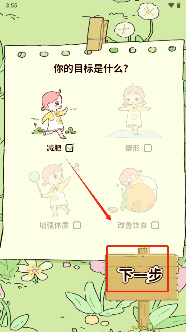 2、选择您的减脂目标,点击“下一步”继续操作。