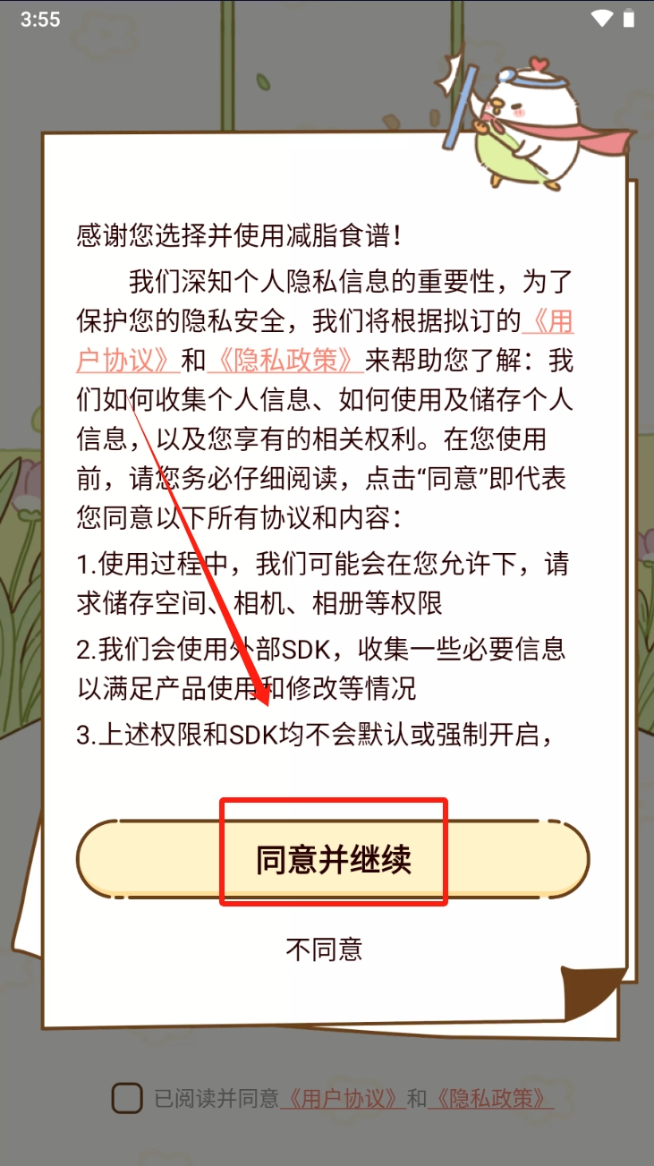 1、阅读并同意《用户协议》和《隐私政策》,点击“同意并继续”。