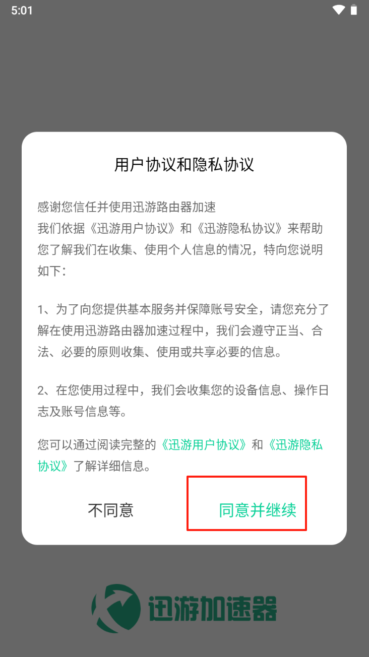 1、点击“同意并继续”以接受用户协议和隐私协议。