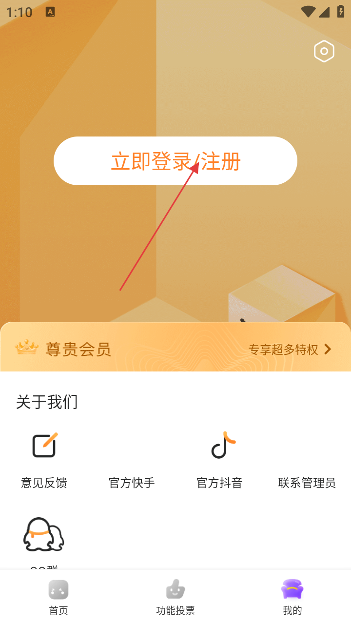 2、在【我的】页面,点击【立即登录/注册】进入登录界面,还可查看关于我们板块的意见反馈、官方账号等信息。