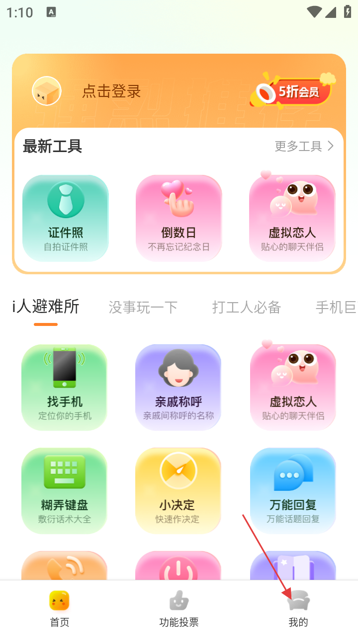 1、在APP首页,可浏览最新工具、i人避难所等板块内容,点击【我的】进入个人页面。