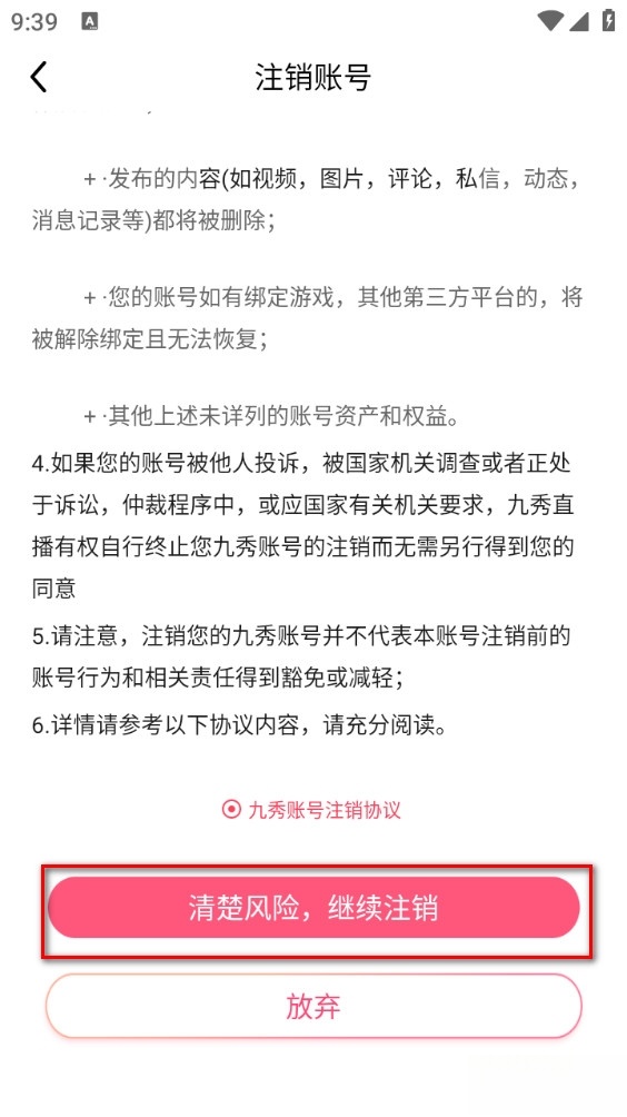 5、同意注销协议后再点击清楚风险,继续注销
