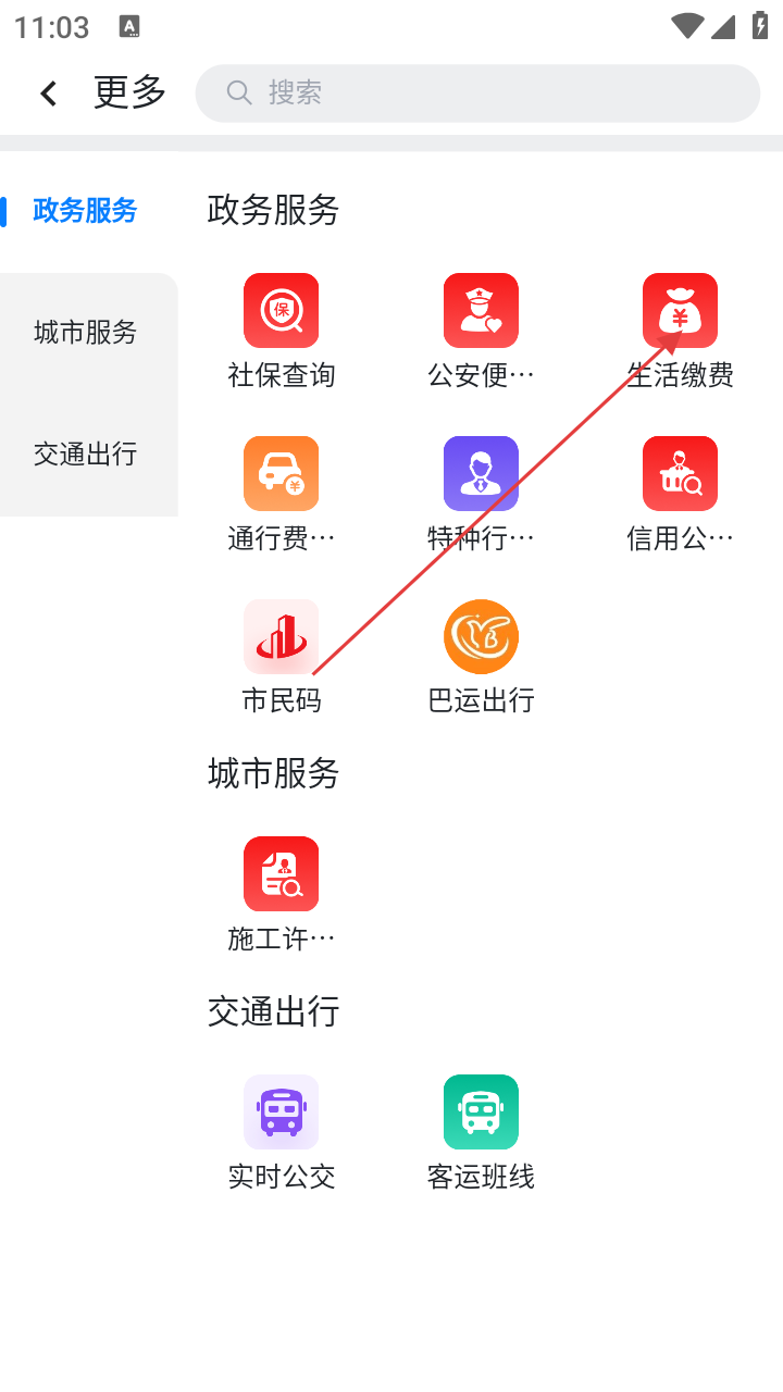 2、在更多页,找到【生活缴费】并点击,进入缴费功能页。