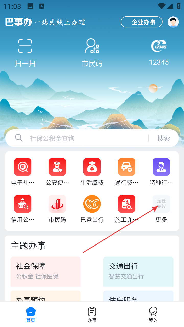 1、打开【巴事办】,在首页点击【更多】,进入服务列表页。