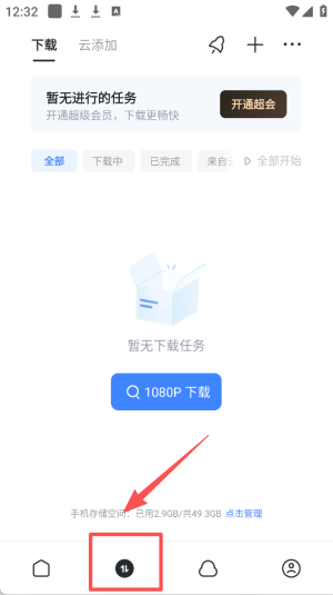 2、在下载管理界面,点击底部的云盘图标,访问云盘。