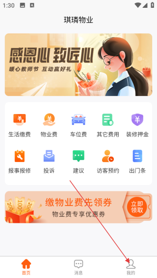 1、进入【琪瑞物业】首页,可看到生活缴费、物业费等功能入口,点击【我的】。