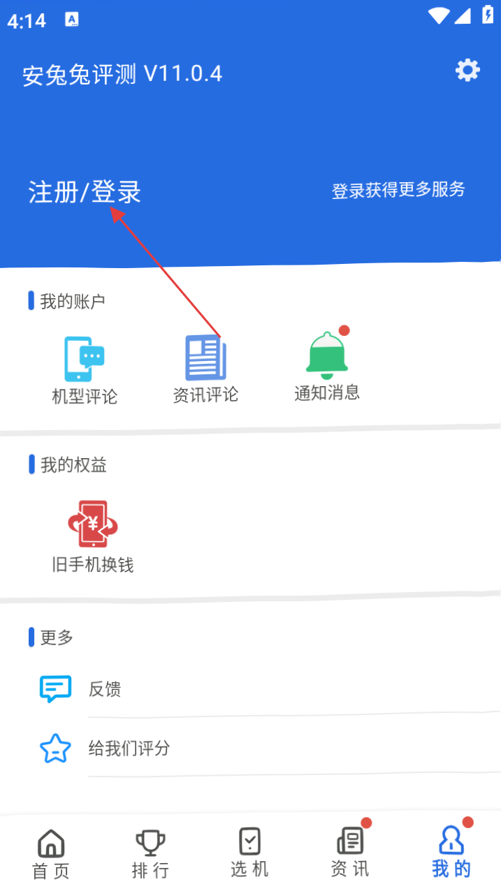 4、点击【登录/注册】完成账号登录,即可使用安兔兔评测APP的设备评测功能。