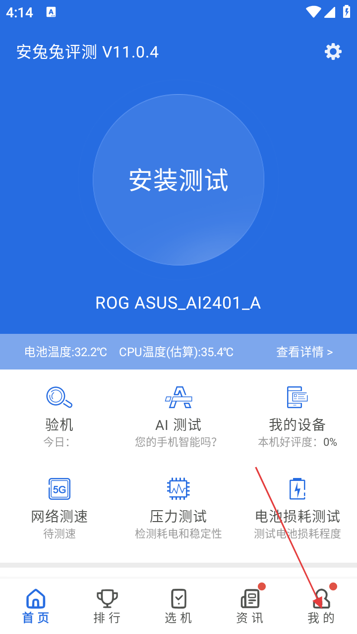 1、在安兔兔评测APP首页,可查看验机、AI测试等功能选项,点击【我的】进入个人页面。
