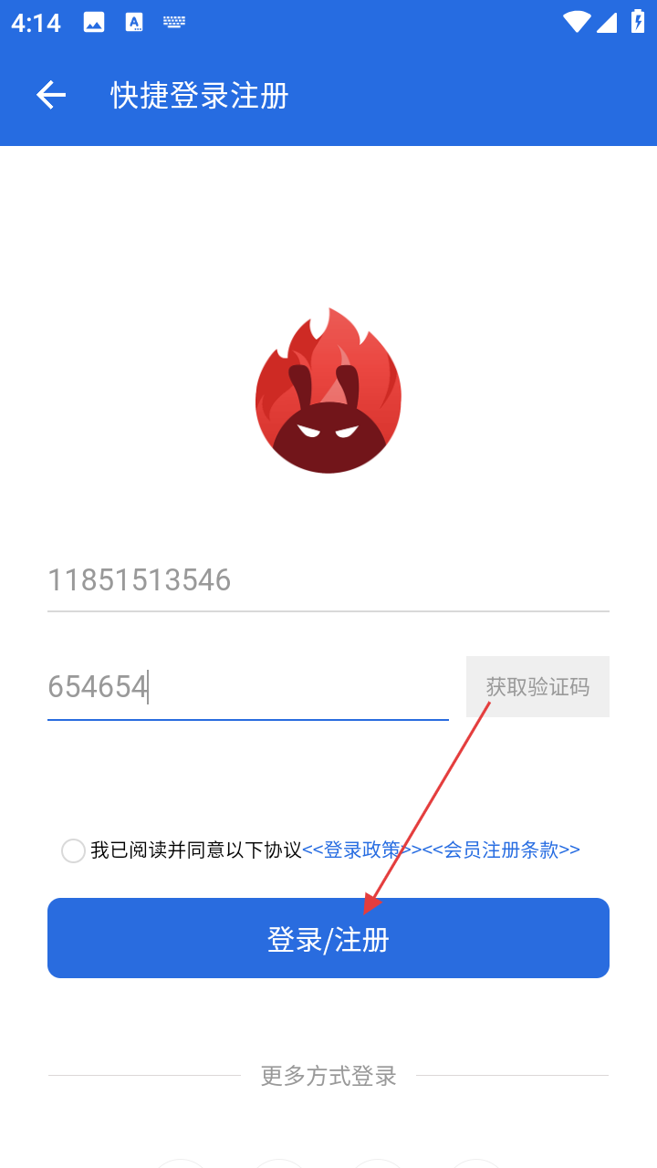 3、在登录界面,输入手机号码和验证码,勾选阅读并同意《登录政策》《会员注册条款》。