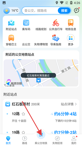 1、进入App首页,点击底部导航栏的【乘公交地铁】选项,进入公交地铁功能页面。
