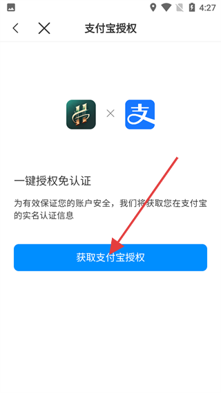 4、在支付宝授权页面,点击【获取支付宝授权】按钮,完成支付宝实名信息的授权,即可完成App的实名认证流程。
