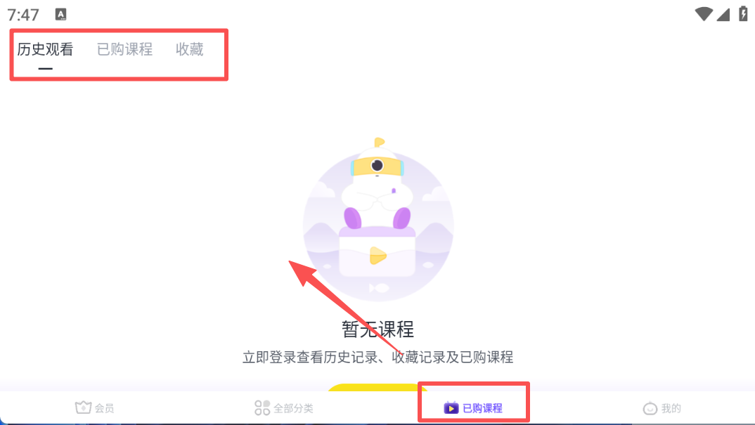 3、点击底部 “已购课程”,页面会呈现历史观看、已购课程、收藏三个板块,登录后可查看对应内容记录。