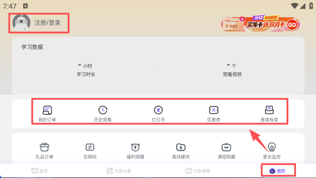 4、点击底部 “我的”,能看到注册 / 登录入口,以及我的订单、历史观看等功能选项,可管理个人学习相关信息。