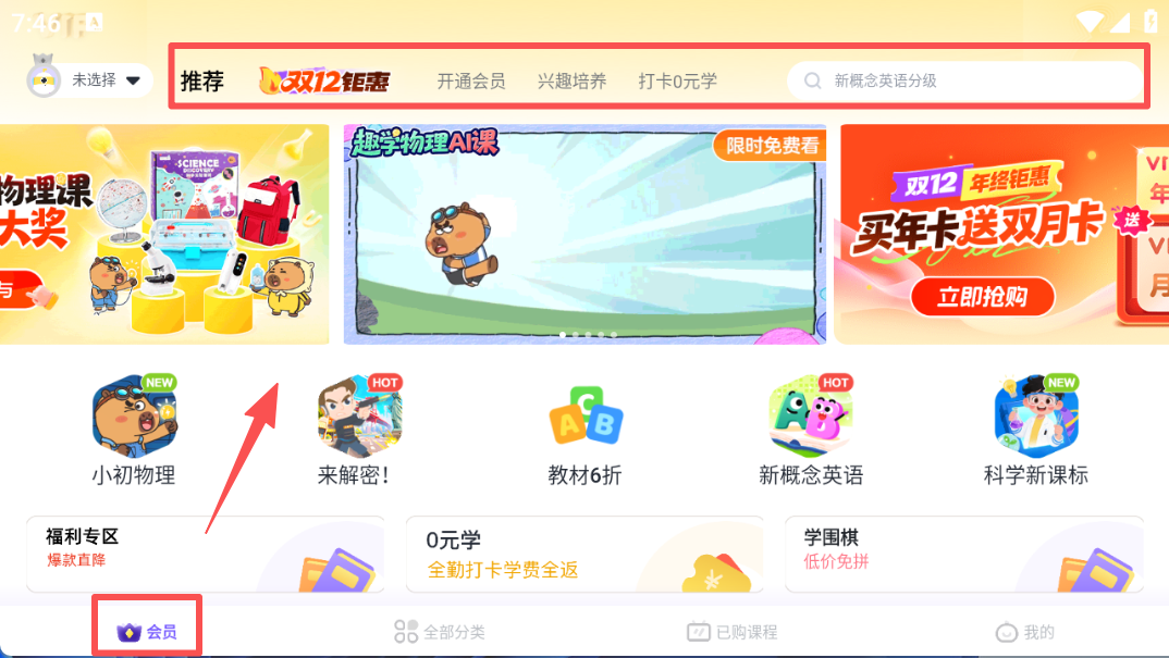 1、进入软件后,先点击底部 “会员”,可看到顶部推荐栏与各类课程入口,能初步浏览平台展示的学习内容。
