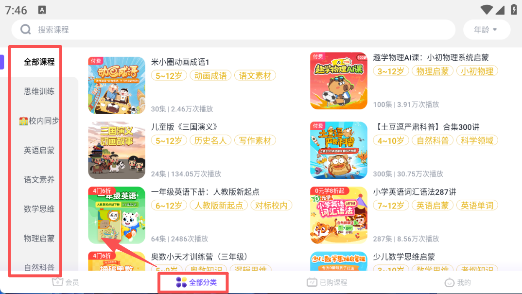 2、点击底部 “全部分类”,左侧会展开课程类别列表,涵盖思维训练、校内同步等,便于精准筛选所需课程。