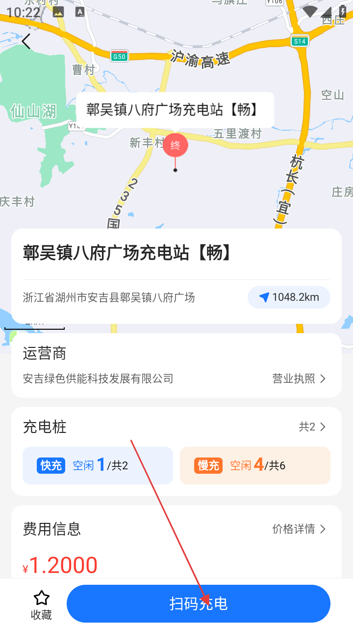 3、查电站详情确认【运营商桩状态】,点【扫码充电】准备连接设备。