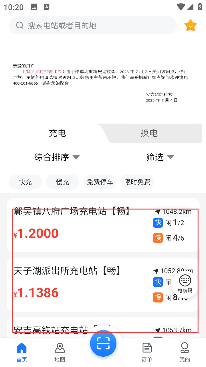 1、选充电站看【价格-空闲桩】,如【鄣吴镇八府广场充电站】,按需挑快充慢充。