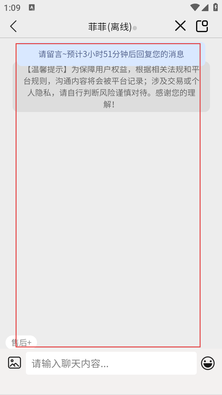 4、进入客服留言界面,可输入聊天内容留言,预计3小时51分钟后会收到回复,沟通内容会被平台记录。