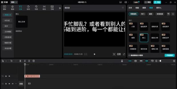 4、选中时间线上的文本,在右侧选择“朗读”,选择一个合适的音色(我随便选了一个“熊二”),点击“开始朗读”,之后会自动在时间线上生成一段音频。