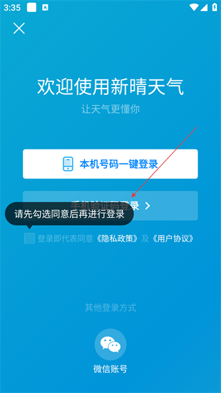 3、在登录界面,选择【手机验证码登录】方式,需先勾选同意《隐私政策》及《用户协议》。