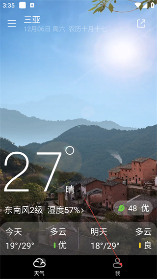 1、在三亚天气主界面,点击底部【我】选项,进入个人中心页面。
