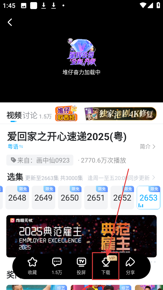 2、进入《爱回家之开心速递2025(粤)》播放页面,若想下载剧集,点击【下载】,就能进入下载选择页面哦。