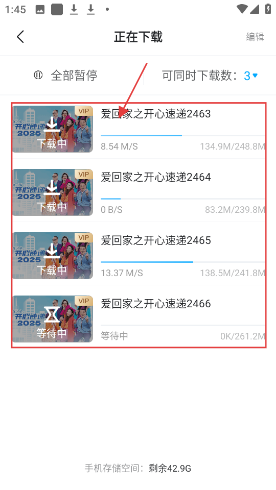 4、选择好集数后,进入“正在下载”页面,能看到下载进度,等待下载完成,就可以离线观看剧集啦。