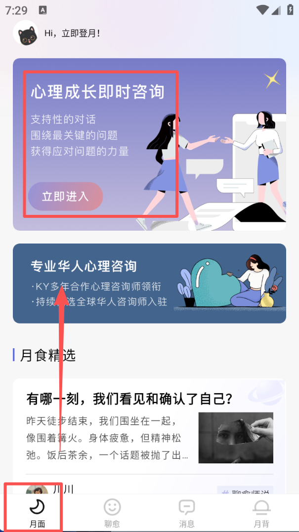1、进入应用后点击底部 “月面” 栏,页面上方会显示 “心理成长即时咨询” 板块,点击 “立即进入” 可查看相关服务。