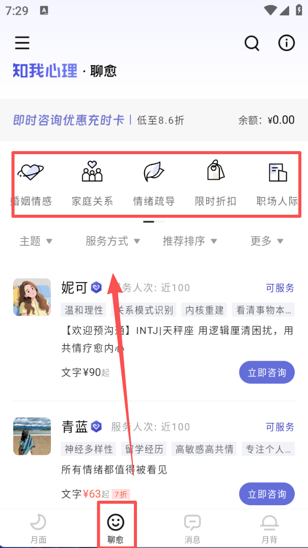 2、切换到底部 “聊愈” 栏,页面中会呈现婚姻情感、家庭关系等分类标签,按需点击能筛选对应领域的咨询服务。