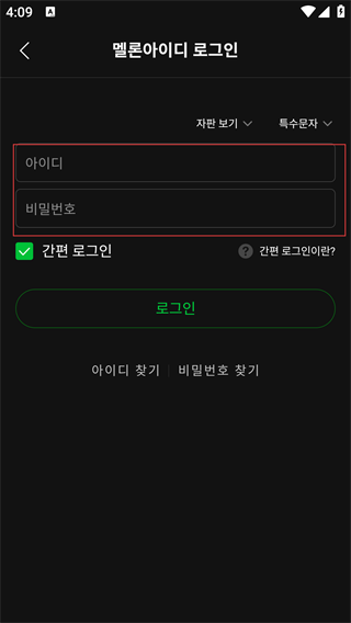 4、在【멜론아이디-로그인】页面,填写【아이디】与【비밀번호】,勾选【간편-로그인】后点【로그인】完成登录。